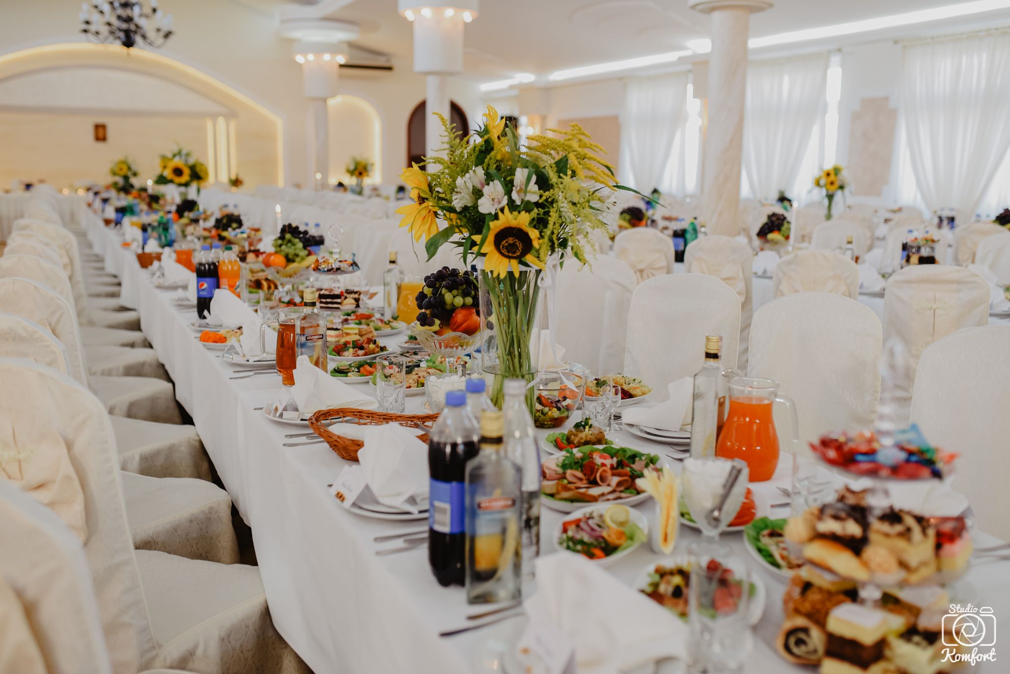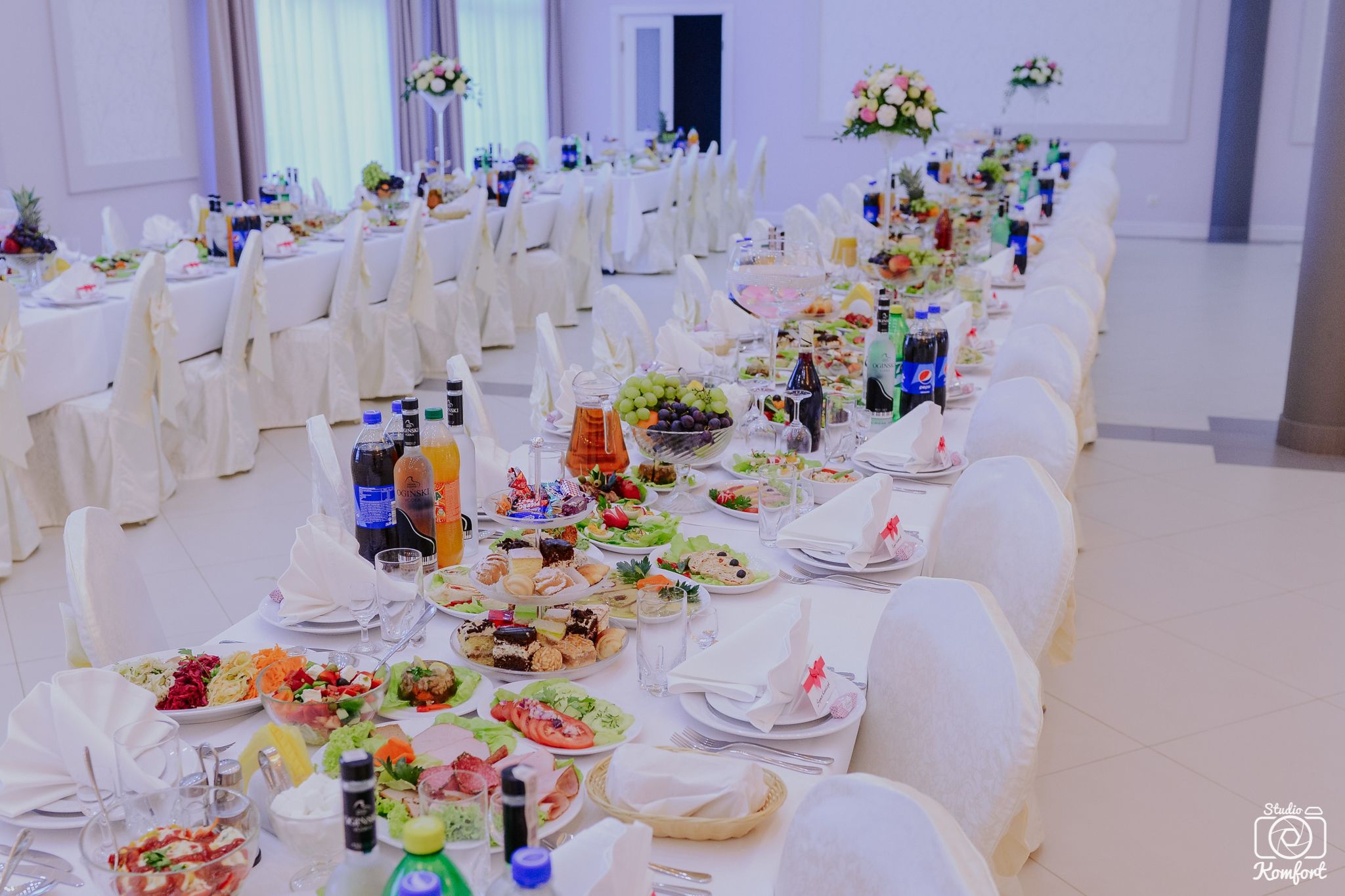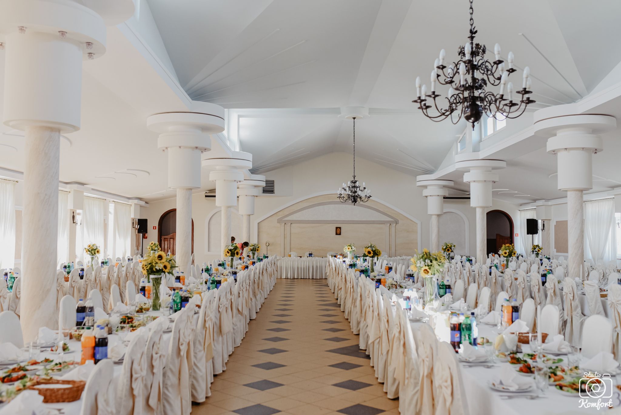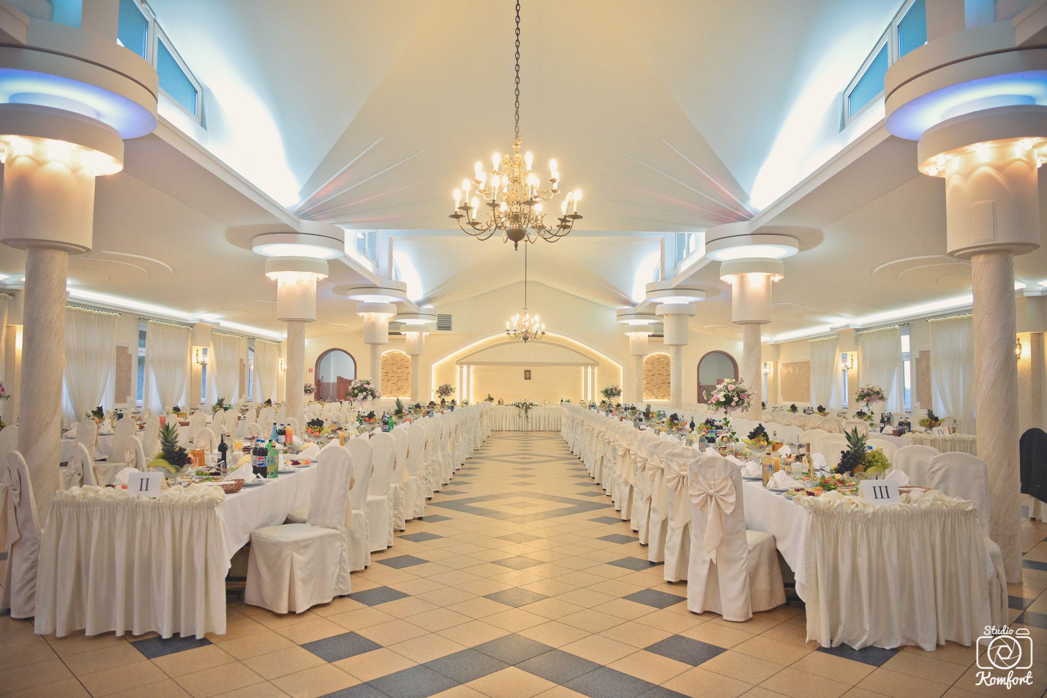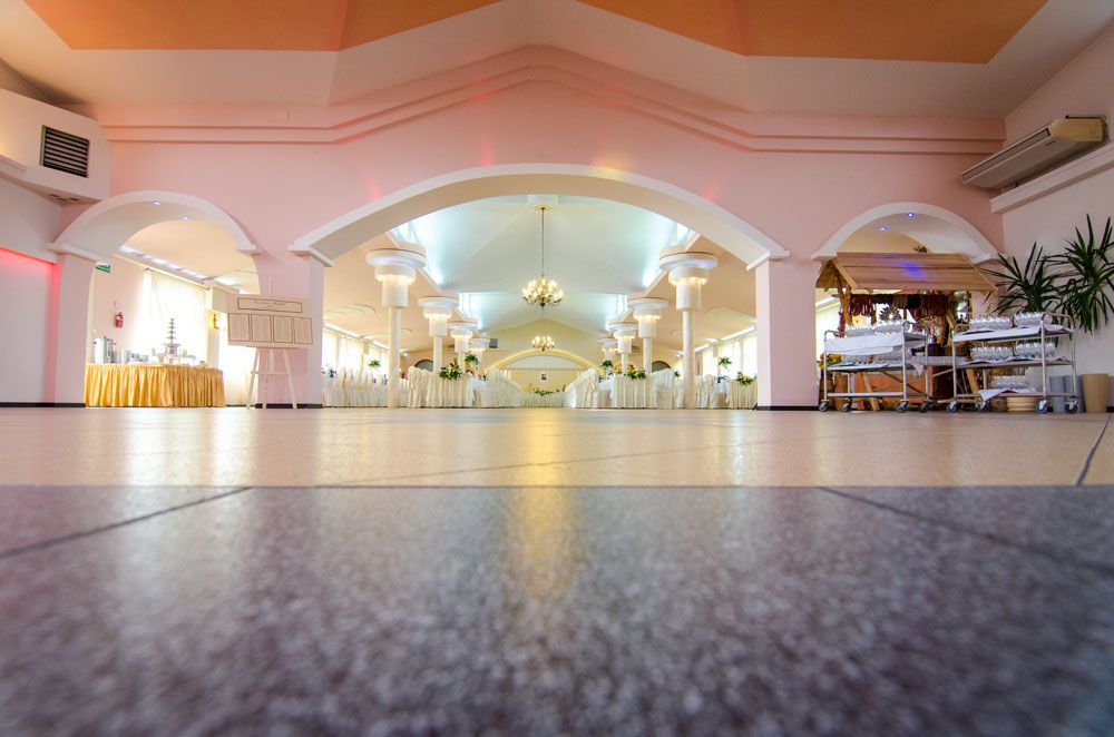 Teren, na którym znajduje się zarówno restauracja jak i sala bankietowa, jest bogato zaaranżowany, otoczony zielenią, oświetlony z dużym parkingiem. Nasza Sala to idealne miejsce na przyjęcia weselne, chrzciny, komunie, bankiety jak również konferencje oraz imprezy dla firm. Sala, na której organizujemy wesela wyposażona jest w duże zaplecze gastronomiczne, klimatyzację i może pomieścić do 360 osób.